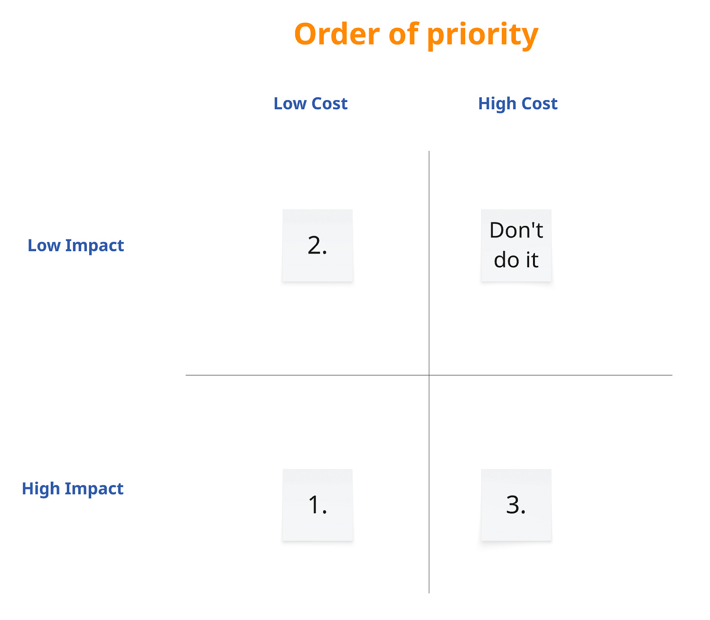 This has to do with the fact that we commonly underestimate high-cost items in terms of time and money, which delays their impact as a consequence. A lot of PM careers were cut short because of ideas that spiraled out of control over multiple quarters and took up their entire attention, neglecting other, more basic things.