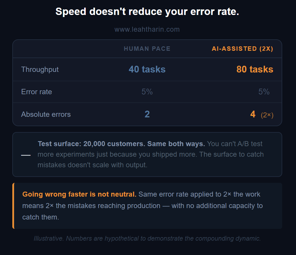 It applies the same error rate to more work. If you’re making 5% errors and you double your throughput, you’ve doubled your absolute mistakes. Your test surface doesn’t scale with output. You still have 20,000 customers. You can’t A/B test more experiments just because you shipped more. Going wrong faster is not neutral.
