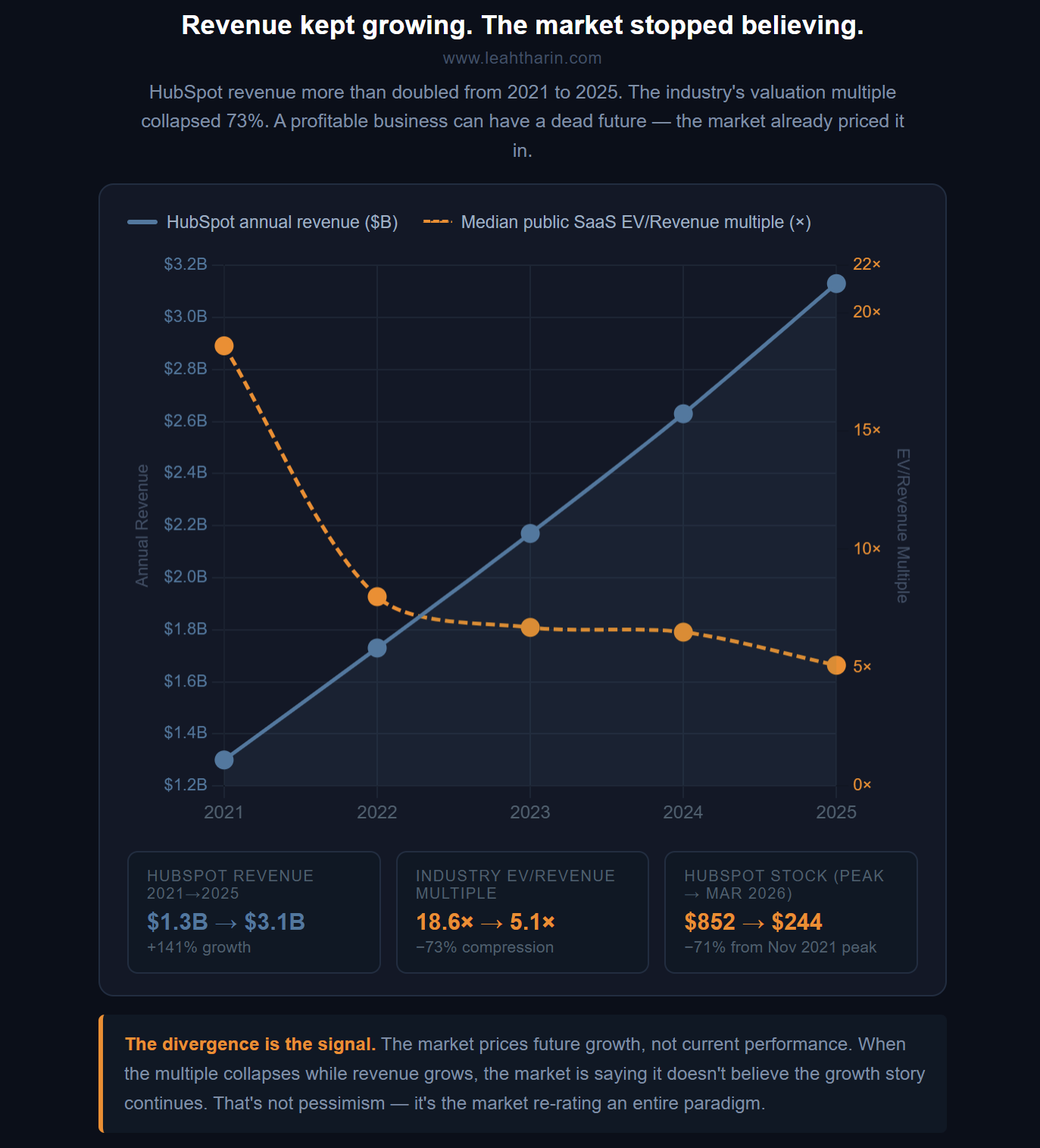 Broad software indices down ~25% from 12-month highs. The median public SaaS valuation multiple: 18.6× revenue in 2021, 5.1× at the end of 2025. That’s 73% compression, while most of the underlying businesses kept growing. The market is saying something: