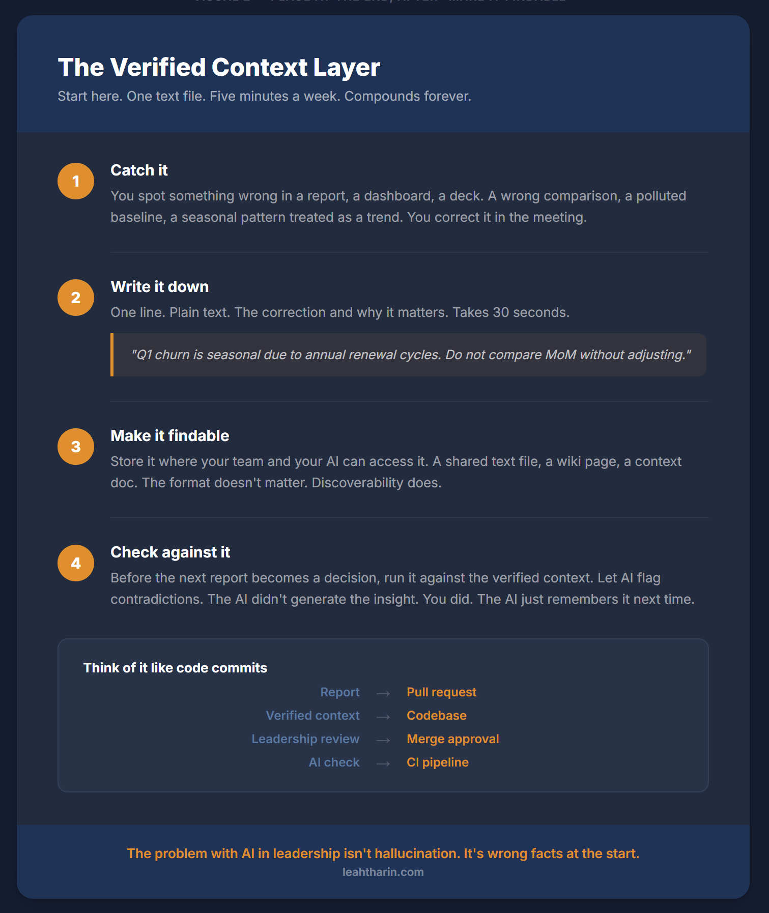 Your verified context layer is the repository. Leadership decisions are the merge approvals. The AI is the CI pipeline that runs the checks.