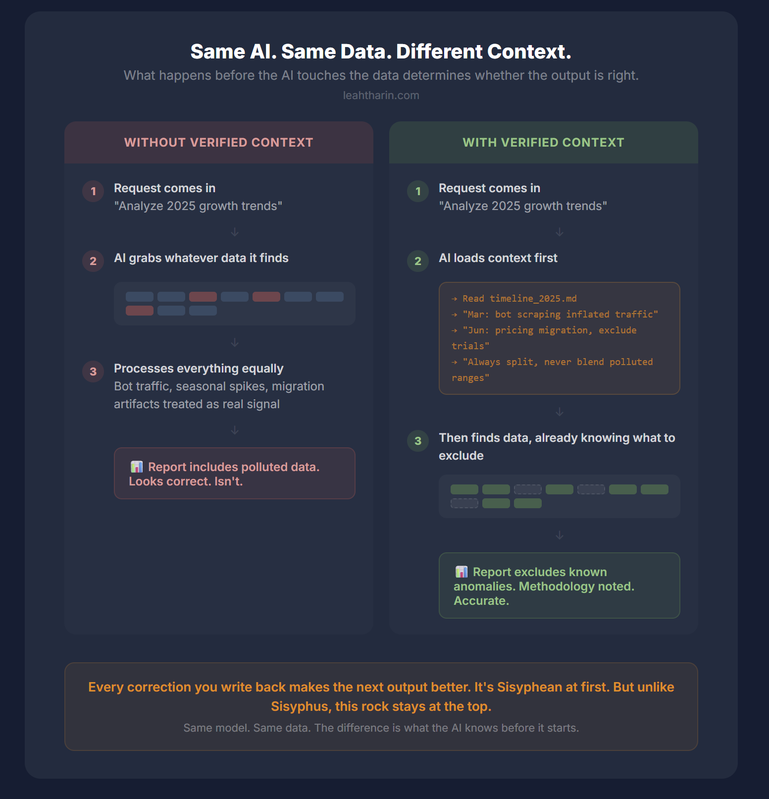 What has changed is the model I’ve built around my AI. Every time I catch an inaccuracy, I write the correction back into the context it loads before conducting any analysis. The same query that gave me a wrong output last week gives me the correct one this week, automatically.